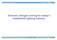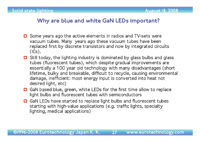 GaN based LEDs have started to replace incandescent light bulbs and fluorescent tubes bringing disruptive change to the global lighting industry. This change is motivated by energy savings and reduction of environmenally harmfull effects of current lighting technologies, enabled by technological discoveries and driven forward by politics and legislation. This report explains the fundamentals of the solid state lighting revolution, the impact on the lamp industry, the key LED markets and their trends, and analyses the players in tomorrow’s new lighting industry.